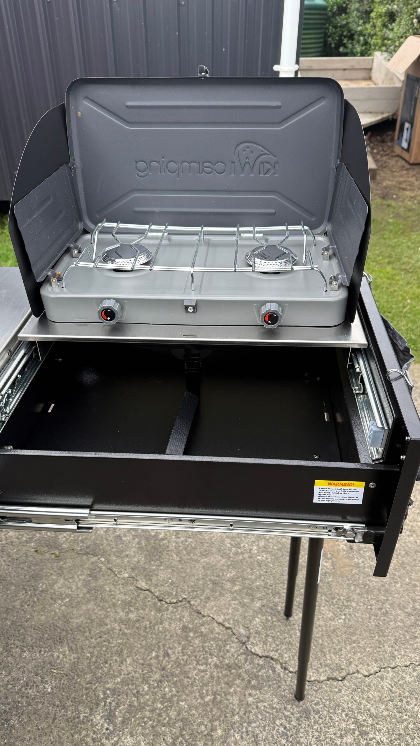 - Rear pull-out kitchen with two-burner gas stove and integrated sink